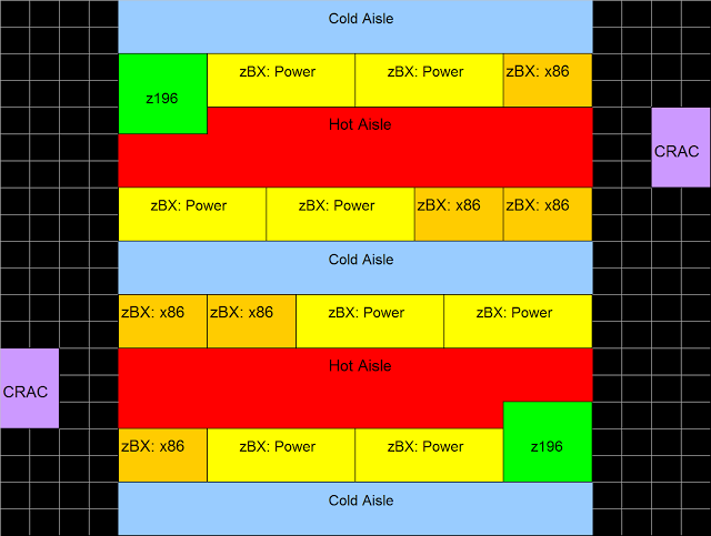 The physical architecture of the MIC data center is designed according to the standards established by the American Society of Heating, Refrigeration, and Air Conditioning Engineers (ASHRAE) Handbook and supplemental information provided in IBM’s zEnterprise 196: Installation Manual for Physical Planning and zEnterprise BladeCenter Extension: Installation Manual for Physical Planning. The MIC data center is located in a small room located in a skyscraper along Wacker Drive in downtown Chicago, Illinois. This room is 40 ft wide and 48 ft long with a 24 inch raised floor utilizing standard 24 inch floor panels. The two ensembles are organized into two rows each for a total of four rows. Because this data center is using air-cooled mainframes, the z196 units are places at opposite ends of the data center to disperse their heat signature. The Computer Room Air Conditioners (CRACs) are located at the end of the hot aisles opposite from the mainframes because the z196 units extend into the hot aisle.